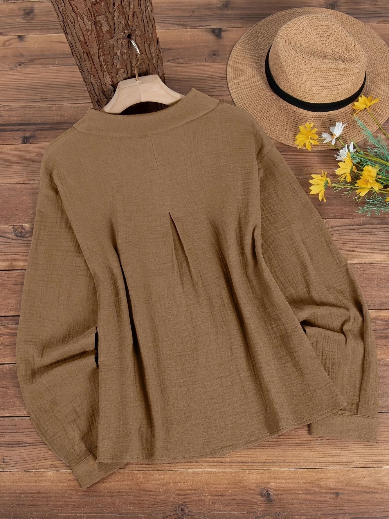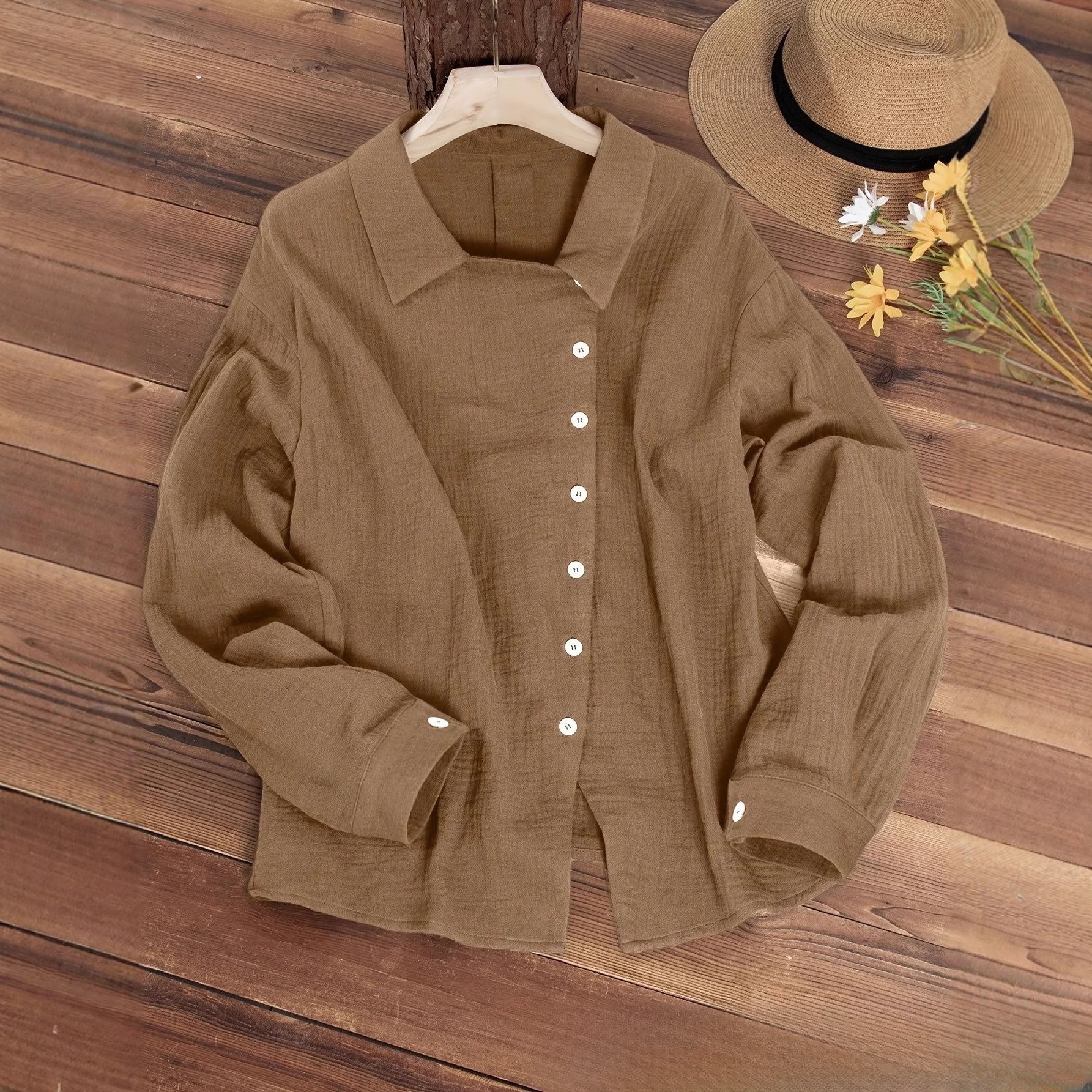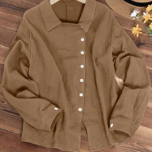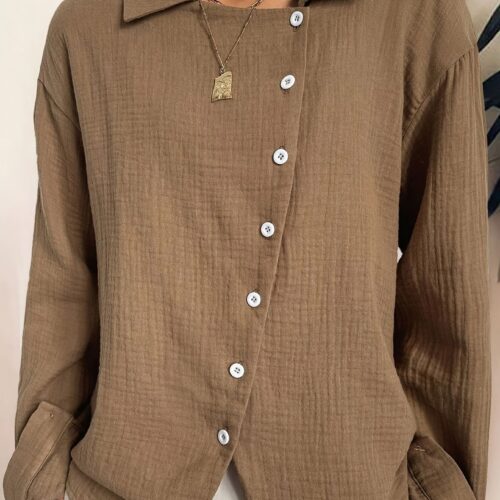 Asymmetrical Linen Shirt is the standout piece for your 2026 travel and leisure wardrobe. This Diagonal Button Blouse features a unique, off-center closure that adds a modern architectural twist to a classic silhouette. Crafted as a breathable Casual Cotton Linen Top, it ensures maximum comfort during warm European summers. The Loose Fit Vacation Shirt cut provides a relaxed drape that pairs perfectly with white linen trousers or denim shorts. Embrace a clean aesthetic with this Minimalist Textured Blouse, designed for the woman who values effortless style and premium natural fabrics.