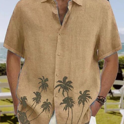 Beach Shirt Short Sleeve Shirt Summer Fashion Trend Palm Tree Printed Top Linen Texture Tee.
