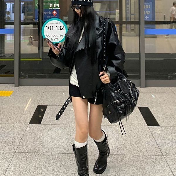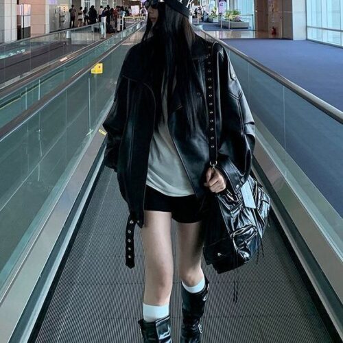 Biker Leather Jacket: Capture the ultimate model-off-duty aesthetic with this premium oversized Biker Leather Jacket, meticulously designed for a bold, retro-inspired silhouette. This piece features a relaxed, loose-fit cut crafted from high-quality black faux leather with a soft, lived-in feel that ensures comfort without sacrificing edge. The design is elevated by authentic motorcycle-inspired details, including wide notched lapels, heavy-duty silver hardware, and a functional waist belt with grommet detailing for a custom fit. Its all-match versatility makes it the perfect transitional layer to throw over a simple white tee or a feminine dress, embodying the effortless street style currently dominating European fashion capitals.