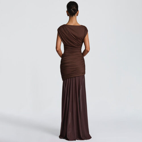 Elegant and effortlessly chic, the Demelza Maxi Dress features a soft modal jersey bodice with a high boat neckline, cross-body pleats on the bust, and flattering ruching through the torso. With drop shoulders, an asymmetric hem, and a fitted waist flowing into a full, flared mesh skirt.