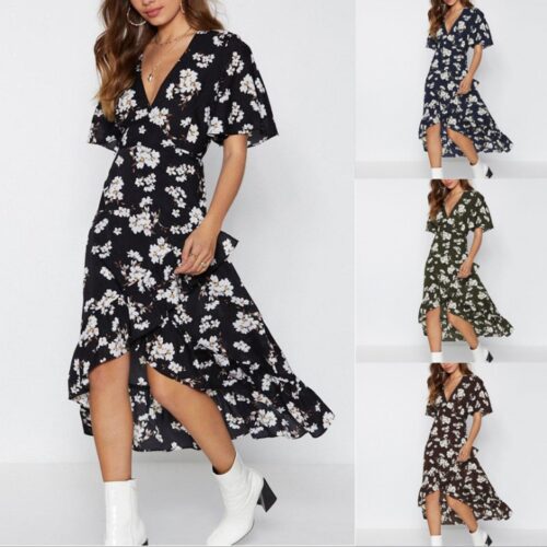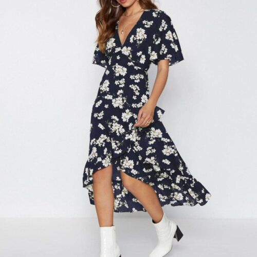 Chiffon Dress elegance defines this stunning black and white botanical silhouette, designed for effortless movement and timeless style. This high low wrap dress features a feminine cascading hemline that transitions perfectly from day to night, offering a sophisticated deep v-neck midi dress look for your next event. Crafted with a delicate short sleeve flutter dress cut, it provides breathable comfort while maintaining a refined aesthetic. As a versatile boho chic ruffle dress, it cinches at the waist to highlight your figure, making it the ultimate choice for garden parties or elegant social gatherings.