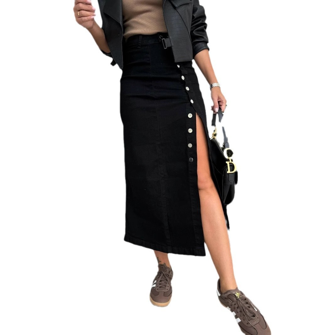 Denim Midi Skirt styles are the ultimate versatile staple for any modern wardrobe, offering a perfect blend of comfort and edge. This chic button down jean skirt features a structured row of metallic buttons that add a vintage-inspired touch to a contemporary silhouette. Designed as a high waisted denim skirt, it cinches the waist beautifully to create an elongated, flattering profile. The bold split front denim skirt detail ensures ease of movement while showing off your favorite footwear. Whether paired with a bodysuit or a cropped tee, this casual blue denim skirt provides a timeless look that transitions effortlessly from city strolls to evening drinks.