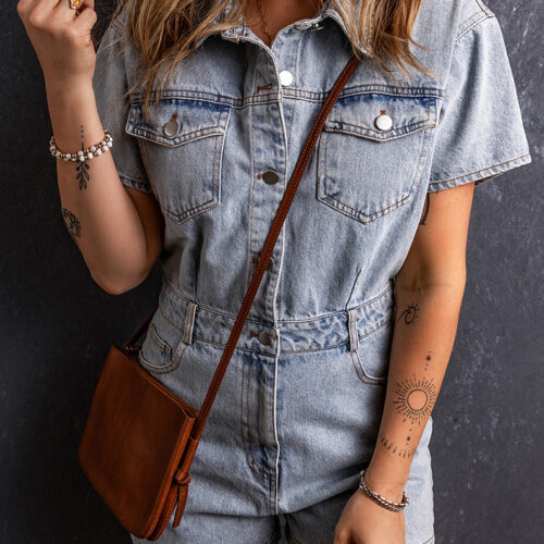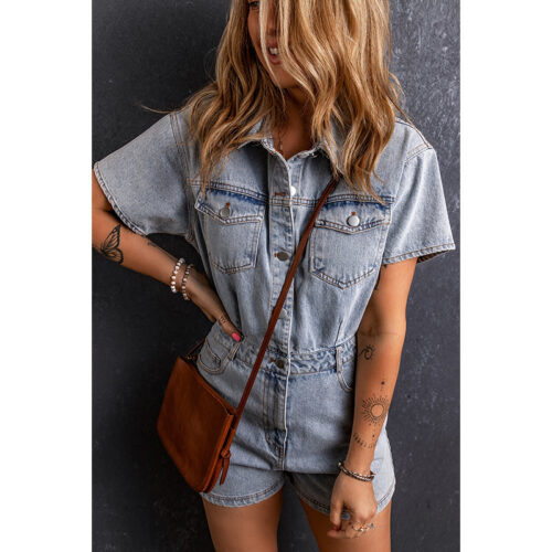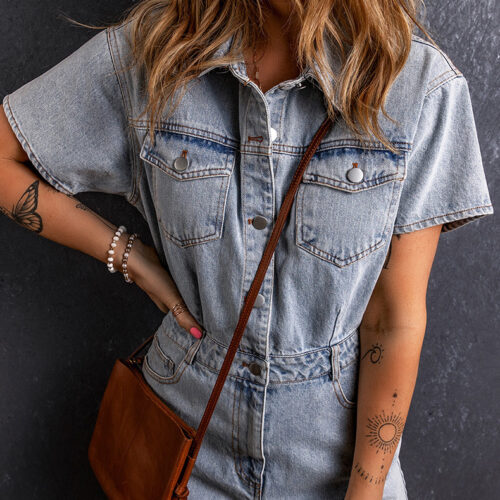 Denim Romper styling reaches a new level of effortless cool with this vintage-inspired silhouette, designed for timeless summer appeal. This short sleeve denim playsuit features a classic collared neckline and a polished button-front fastening, making it the ultimate vintage blue button-up jumpsuit for your daily rotation. Engineered as a casual utility denim one-piece, it includes functional chest pockets and a cinched waist for a structured yet comfortable fit. Whether paired with sneakers or sandals, this retro washed summer romper offers a breathable, high-quality feel that transitions perfectly from morning city strolls to casual evening hangouts.