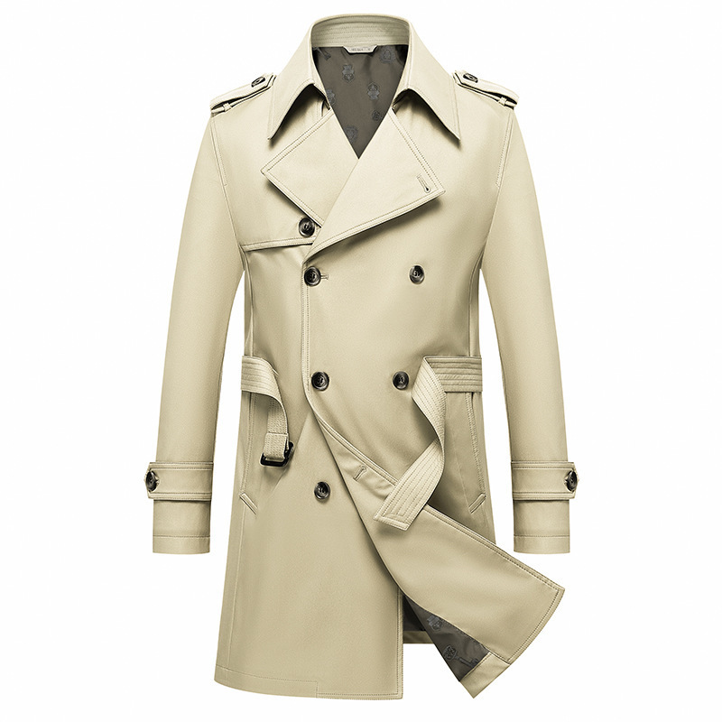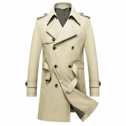 Double Breasted Trench – Elevate your style with this iconic piece of men’s outerwear, a hallmark of European sophistication. This mid-length coat features a classic double-breasted front with high-contrast buttons that create a powerful, structured silhouette. Designed with a wide notched lapel and adjustable cuff straps, it strikes the perfect balance between military heritage and modern urban fashion. The neutral beige tone offers endless versatility, allowing it to layer seamlessly over a crisp business suit or a casual weekend knit. Crafted from durable, breathable fabric, it is the ideal solution for the stylish man navigating the transitional weather of London, Paris, or Berlin.