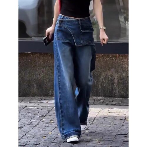 Double Waistband Jeans create a bold, high-fashion statement with a unique layered effect that mimics a layered street-style look. These faux two piece denim trousers feature an innovative asymmetric waist wide leg pants design, complete with a functional flap pocket detail for an edgy, utilitarian touch. Engineered as high waisted deconstructed jeans, they offer a sculptural silhouette that provides maximum comfort without sacrificing style. This designer style baggy denim is the perfect choice for those seeking a modern, avant-garde addition to their urban wardrobe.