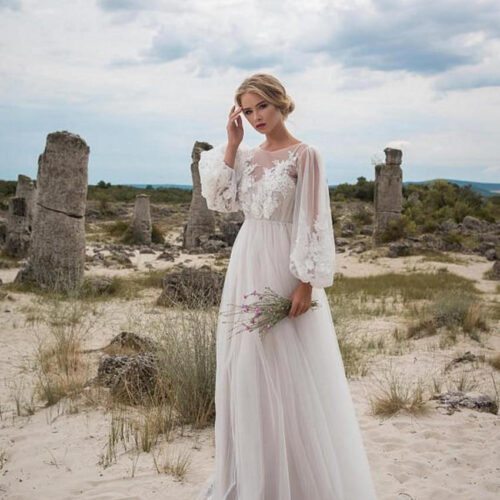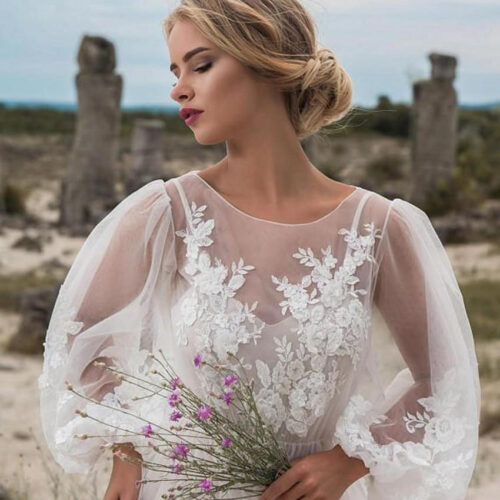 Embroidered Wedding Dress artistry defines this ethereal bridal piece, featuring delicate floral lace appliqués that bloom across a sheer bodice. This Round Collar Bridal Gown offers a modest yet sophisticated neckline, perfectly complemented by romantic, voluminous Gauze Sleeve Wedding Dress details. Designed as a Floral Lace Marriage Dress, the intricate needlework creates a soft, textured finish that flows into a lightweight skirt. As a premier choice for Bohemian Sheer Bridal Wear, this gown captures a dreamlike aesthetic, making it the perfect silhouette for outdoor, beach, or rustic garden ceremonies.