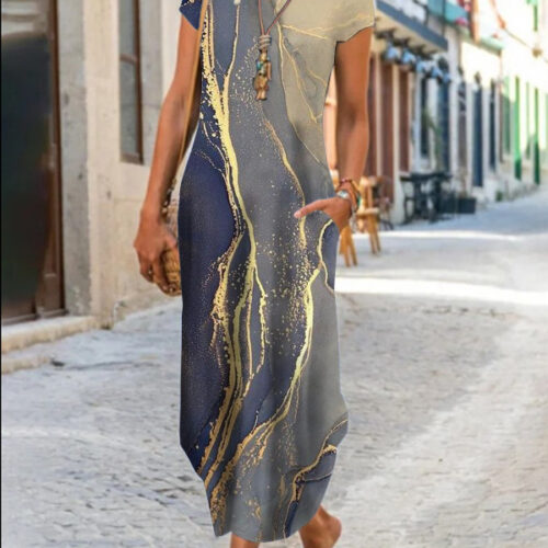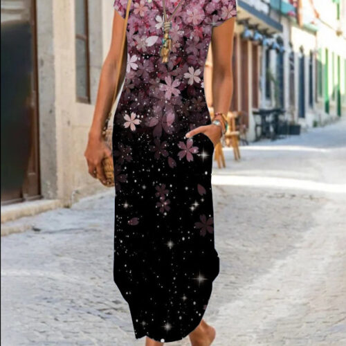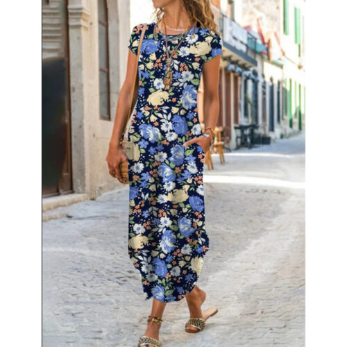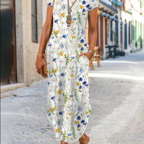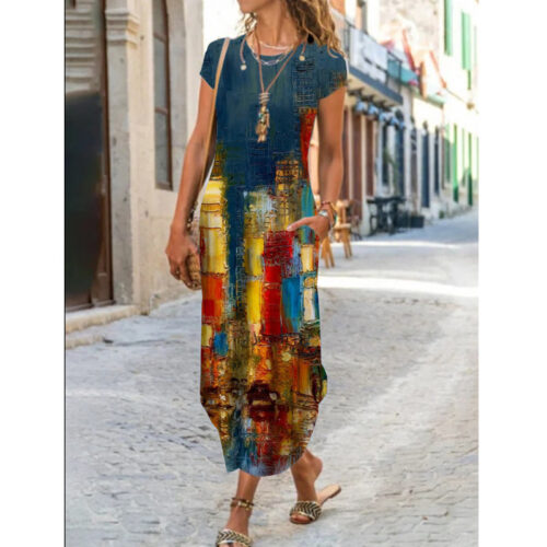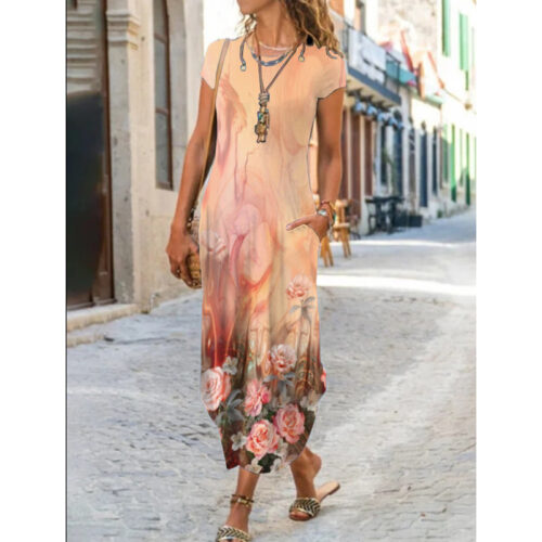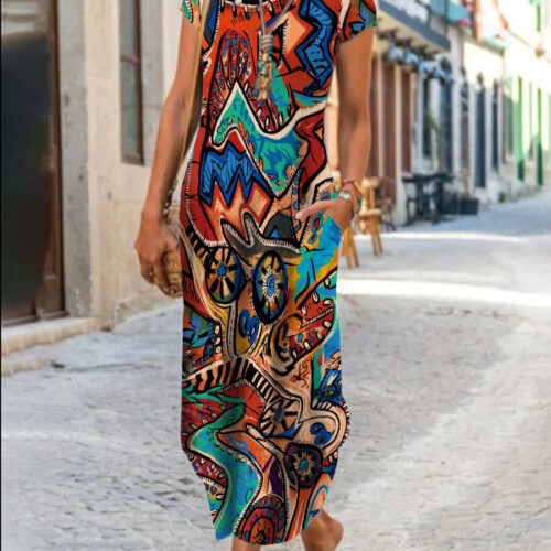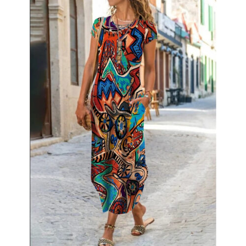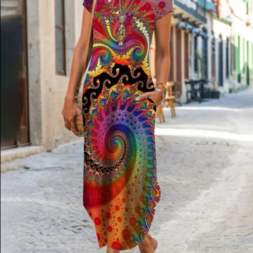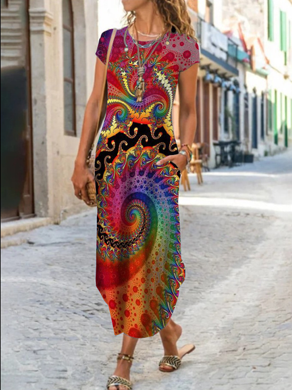 Product Content Floral Maxi Dress elegance is reimagined in this vibrant, floor-length silhouette featuring a mesmerizing kaleidoscopic print. This functional short sleeve pocket dress blends artistic flair with everyday utility, making it a standout boho graphic sundress for your seasonal wardrobe. As an abstract pattern long gown, it offers a breezy, relaxed fit that moves gracefully with every step. Whether styled for an outdoor wedding or used as casual round neck loungewear, this versatile piece provides a sophisticated look without compromising on the comfort of breathable, high-quality fabric.