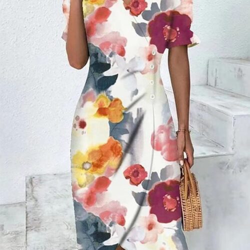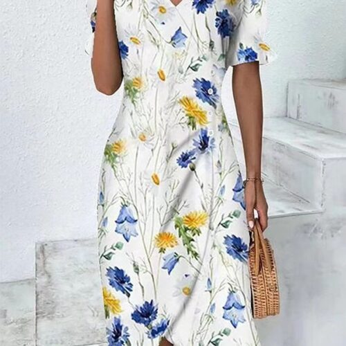 Product Content Floral V-Neck Dress elegance defines this stunning white and pink botanical silhouette. This short sleeve wrap dress features a flattering crossover neckline and a unique side button tea dress detail that creates a sophisticated, draped effect. As an elegant midi sun dress, it offers a comfortable A-line fit that is perfect for outdoor events, while the vibrant pattern makes it the ultimate boho chic garden party dress. Crafted from lightweight, breathable fabric, this piece ensures you stay cool and polished from morning brunch to evening celebrations.