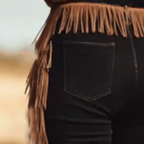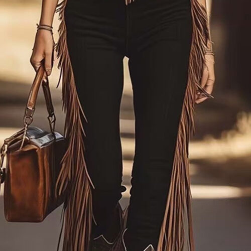 Ride into style with our Women’s Vintage Western Fringe Pants, where rustic charm meets contemporary comfort. These expertly tailored trousers feature cascading fringe details along the waistband and outer leg seams  that swing with every step, creating dynamic movement perfect for dancing at Western music festivals or adding flair to casual outfits. The slim-fit silhouette and stretch fabric  ensure a comfortable, flattering fit that moves with you, while the solid color palette keeps the focus on the intricate fringe detailing.