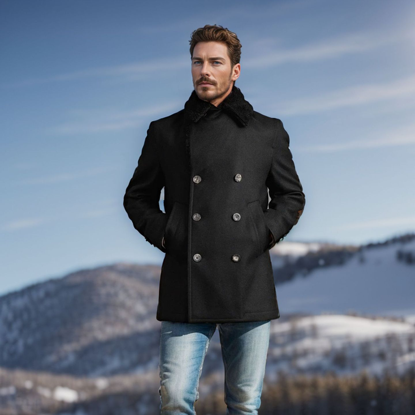 Fur Collar Coat styling meets high-performance warmth in this premium winter essential. This Men’s Wool Peacoat features a classic navy-inspired silhouette, upgraded with a plush, insulating collar for maximum protection against the cold. Designed as a sophisticated Double Breasted Jacket, it utilizes a luxurious Cashmere Blend Overcoat fabric that offers an incredibly soft touch and superior heat retention. This Slim Fit Winter Outerwear is meticulously tailored to provide a sharp, modern profile, making it the perfect choice for the style-conscious man in any European climate.