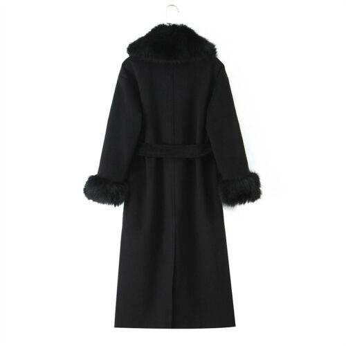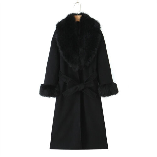 Fur Collar Wool Coat: Experience ultimate European glamour with this breathtaking longline winter overcoat in classic midnight black. Meticulously crafted from a premium wool blend, this piece features an oversized, plush faux fur collar and matching statement fur cuffs that define high-end sophistication. The structured maxi silhouette includes a versatile wrap-around belt to cinch the waist for a feminine, tailored fit. Designed for superior warmth and a dramatic “Old Money” aesthetic, this coat is the perfect investment piece for elegant evening events and stylish city winters.