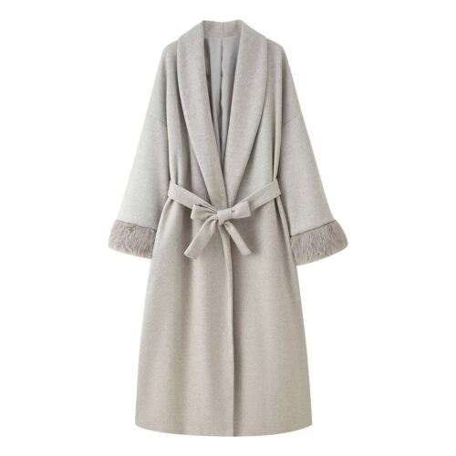 Fur Cuff Wool Coat: Elevate your seasonal wardrobe with this breathtakingly sophisticated longline overcoat in a timeless heather grey. Crafted from a premium wool blend, this piece features luxurious, oversized faux fur cuffs and a graceful shawl collar that defines European elegance. The adjustable tie-waist belt allows you to cinch the silhouette for a tailored look or wear it open for a relaxed, flowy aesthetic. Designed for maximum warmth and style, this ankle-grazing wrap coat is the perfect statement layer for both professional city commutes and glamorous winter evenings.