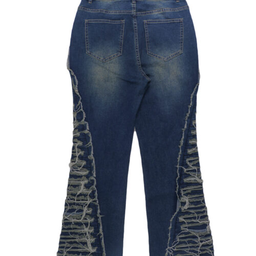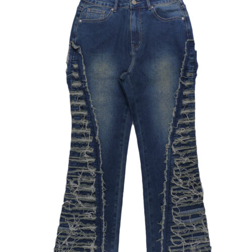 High Waisted Trousers in this striking denim finish offer a dramatic, leg-lengthening silhouette that sits perfectly at the natural waist for a secure and flattering fit. These extremely distressed denim pieces feature a revolutionary deconstructed aesthetic, blending a slim upper fit with an avant-garde flare. Designed as shredded flare leg pants, they showcase intricate horizontal texture and heavy fringing that creates movement with every step. These deconstructed streetwear jeans redefine urban fashion, serving as the ultimate fringed statement denim for those who want to push the boundaries of traditional style.