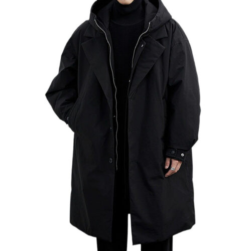 ooded Trench Coat – A masterclass in modern utility and European elegance, this mid-length piece is designed for the man who refuses to compromise on style during unpredictable weather. The unique “false two-piece” design features a built-in hood and inner layering effect that provides the sleek aesthetic of a classic trench with the practical warmth of a technical jacket. Crafted from a refined, water-repellent fabric, it offers a sophisticated silhouette suitable for both professional office commutes and weekend city walks. The streamlined mid-length cut ensures ease of movement while the hooded construction adds a contemporary, functional edge that is currently defining the fashion landscape.