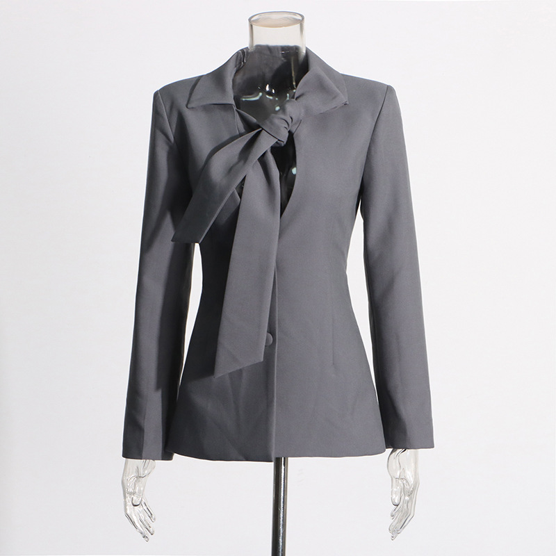 Lace Up Blazer elegance is redefined in this sophisticated slate grey silhouette, designed to offer a custom, cinched fit through its unique adjustable closure. This stunning tie front tailored jacket features a dramatic oversized knot that serves as a modern focal point, elevating your standard single breasted grey outerwear. As a standout chic knot detail blazer, it provides a statuesque profile that functions beautifully as a high-end slim fit lapel cardigan alternative. Crafted with precision, this piece ensures a polished look for executive meetings or elite evening social gatherings.