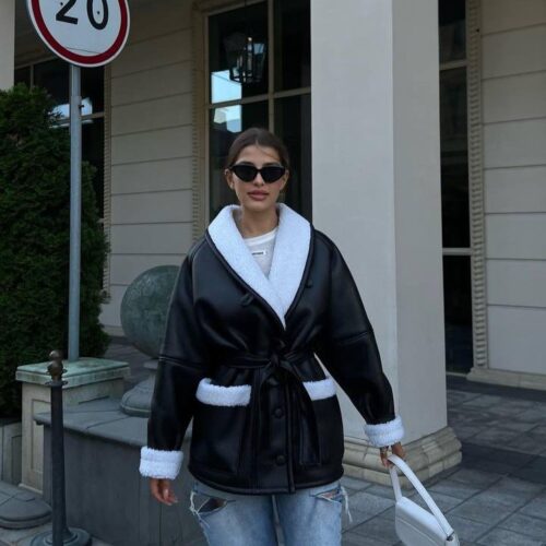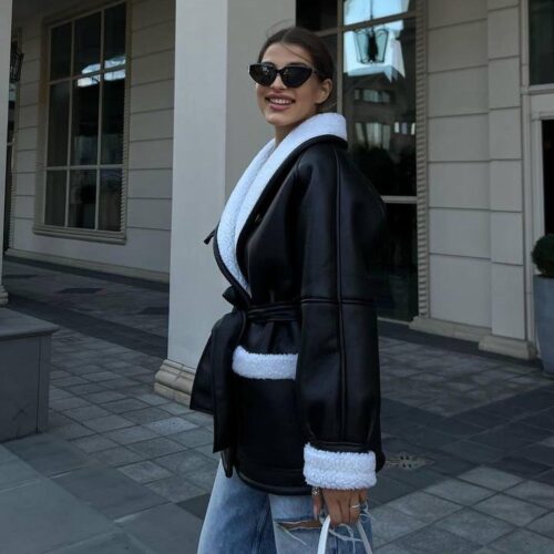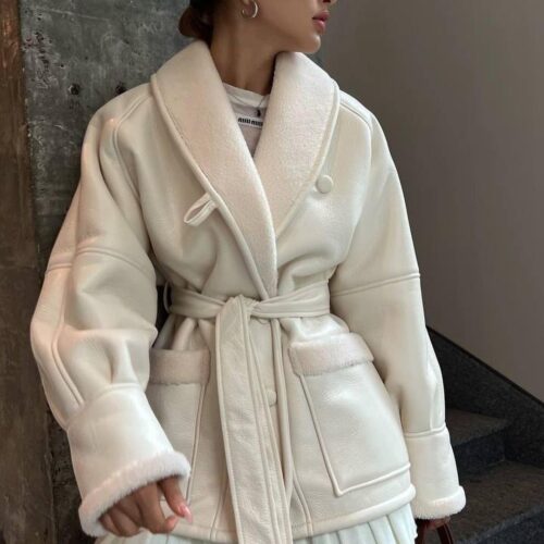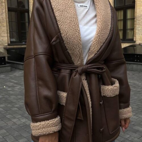 Leather and Fur Coat: Elevate your winter wardrobe with this sophisticated Korean-style splicing jacket, a perfect blend of edgy faux leather and opulent plush fur. This Leather and Fur Coat features premium chocolate brown leather panels expertly contrasted with a voluminous, cream-colored shearling-style collar and cuffs for a multi-textured, high-fashion look. The structured, mid-length design includes a waist-cinching tie belt and deep utility pockets to ensure maximum warmth and functionality without sacrificing your silhouette. Whether styled over a sleek turtleneck for a professional city look or paired with denim for a weekend “Street Style” aesthetic, this personality jacket is a must-have investment for the 2026 season.