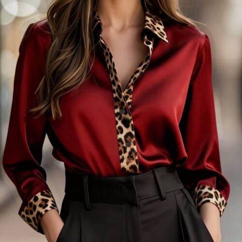 Leopard Trim Satin Shirt is a sophisticated statement piece for your 2026 autumn and winter wardrobe. This Dark Green Silk Blouse offers a luxurious glossy finish that contrasts beautifully with the bold Spliced Leopard Print Top detailing on the collar and cuffs. Designed as a versatile Long Sleeve Satin Party Shirt, it transitions effortlessly from office elegance to evening glamour. The unique Crew Neck Spliced Blouse construction provides a refined silhouette, ensuring you stand out with a touch of modern European chic and timeless animal print flair.