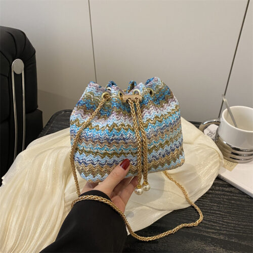 Luxury Woven Beach Bag sets the standard for 2026 resort elegance. This Diamond Embellished Bucket Bag features a vibrant, multi-colored rainbow weave that captures the high-energy spirit of the Mediterranean. As a Designer Colorful Straw Purse, it is uniquely adorned with a gold-tone drawstring chain and pearl accents, elevating it from simple shore-wear to a sophisticated evening accessory. The Premium Chain Shoulder Beach Bag design provides a lightweight yet durable structure, while the Rainbow Woven Crossbody Tote functionality ensures you carry your vacation essentials with a unique personality. Free shipping.