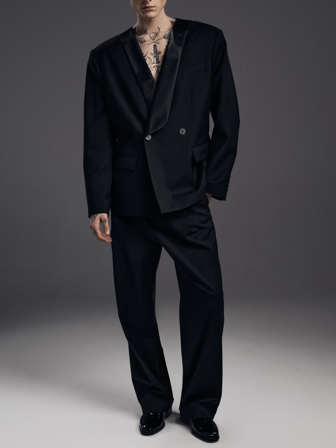 Men’s Blazer excellence is redefined in this avant-garde black wide lapel asymmetric blazer. This unique black asymmetric blazer features a striking off-center closure that challenges traditional silhouettes while maintaining a sharp, structured fit. The bold wide lapel blazer design adds a touch of high-fashion authority, making it an ideal designer men’s suit jacket for both formal and creative settings. Crafted with the precision of a slim fit tailored blazer, this piece offers a refined modern edge, ensuring a powerful and sophisticated appearance for any occasion.