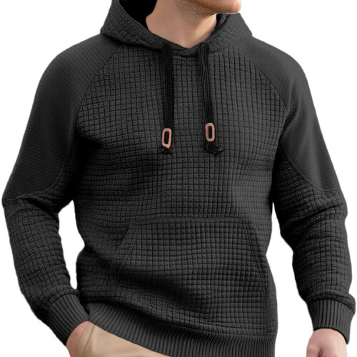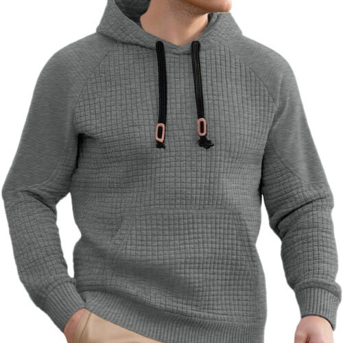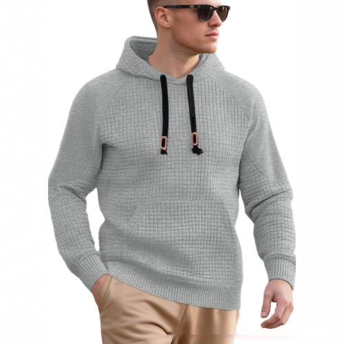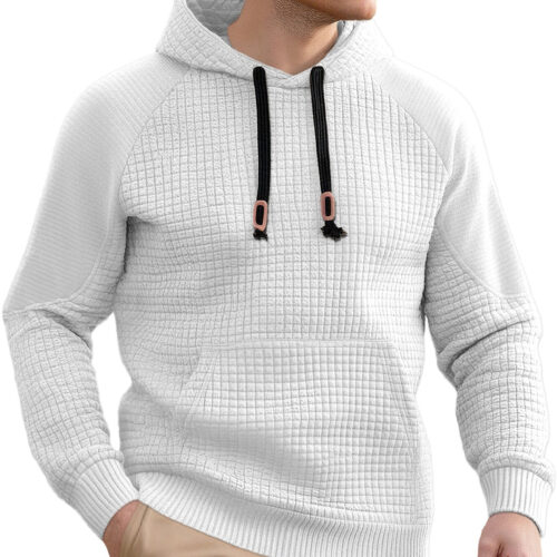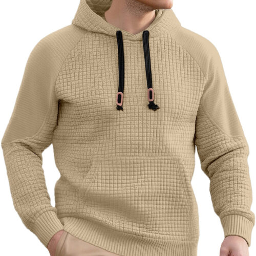 Men’s Casual Hoodie. A standout Jacquard Sweatshirt, it features an intricate geometric waffle texture that elevates the classic Slim Fit Hooded Top silhouette. This Textured Knit Pullover is crafted for comfort and durability, featuring a functional drawstring hood and exquisite ribbed cuff detailing. Ideal for Athletic Urban Wear, its all-match aesthetic—available in a palette of sophisticated neutrals including grey, navy, and khaki—makes it a versatile staple for the season.