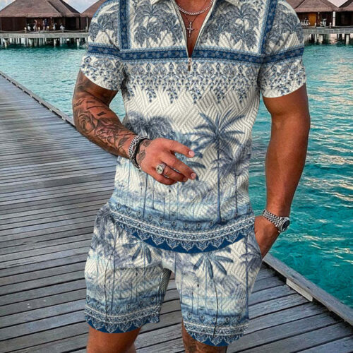 Men’s Geometric Zipper Polo Set redefines contemporary poolside elegance. This 3D Print Resort Wear Outfit features an intricate blue-and-white tile pattern and a sleek Blue Mediterranean Zip Lapel Top, offering a sophisticated alternative to traditional buttons. As a complete Coordinated Summer Beach Suit, the lightweight, moisture-wicking fabric provides ultimate breathability for tropical climates. This Modern Boho Geometric Two-Piece combines precision digital printing with a tailored fit, making it an essential luxury staple for your seasonal travels.