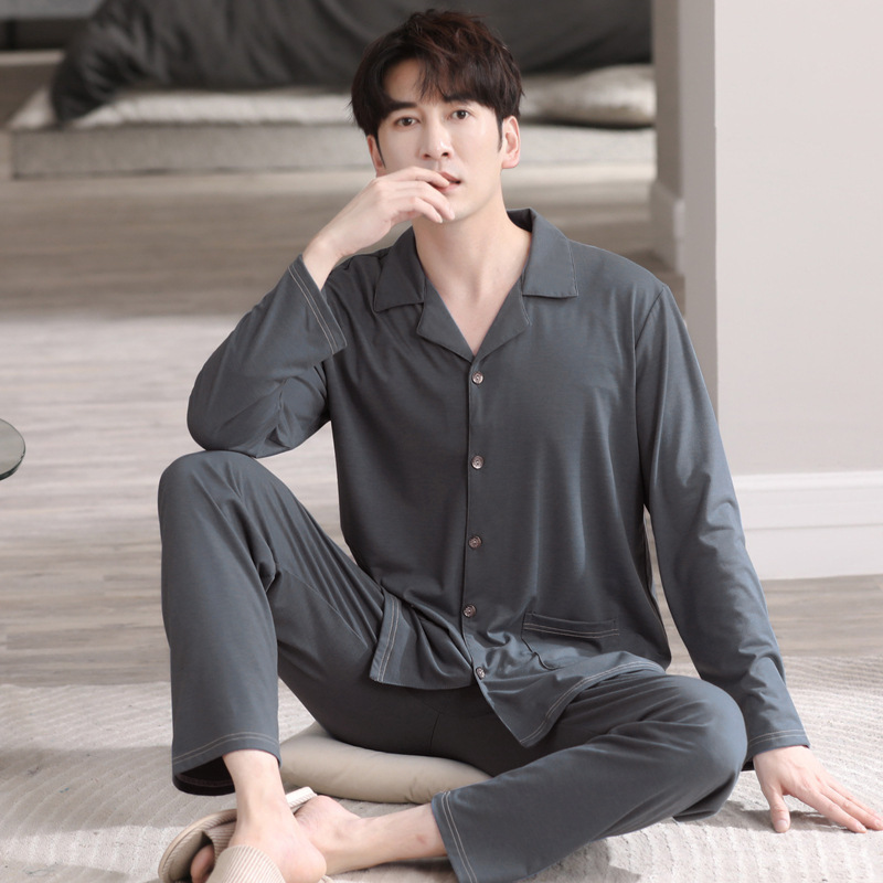 Experience ultimate comfort with this luxurious Mens Loungewear Set crafted in premium breathable Mens Modal Sleepwear fabric. Featuring a classic button-down cardigan collar top in elegant grey/taupe tone with full-length matching trousers, this Mens Long Sleeve Nightwear delivers all-night softness and unmatched relaxation. The refined Mens Button Down Homewear suit is perfectly tailored for modern men who value style and comfort — ideal for lounging, sleeping, or casual home wear daily across USA, UK, Germany, Italy and all Europe.
