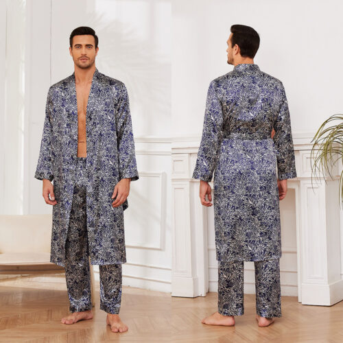 Men’s Silk Pajamas Set offers an unparalleled combination of elegance and comfort for your evening routine. This satin long sleeve sleepwear collection features a high-luster finish that feels exceptionally smooth against the skin, making it a standout luxury printed lounge suit. The intricate blue floral pattern homewear design is complemented by a classic button-down front and relaxed-fit trousers, providing a sophisticated silhouette. Engineered as thin fall pajamas for men, this two-piece set ensures breathable warmth and a refined look for both sleeping and lounging.