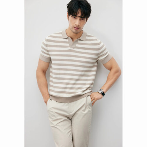 Redefine summer luxury with these mens silk short sleeve shirts, featuring innovative “Ice Silk” cooling technology for maximum breathability. A sophisticated alternative to standard mens casual t shirts, this Knitted Sweater offers a refined striped shirt aesthetic in a timeless beige and white palette. Engineered with a sharp V-neck Lapel Slim fit, it provides a tailored silhouette perfect for upscale resort wear or smart-casual outings. This all-match staple combines high-end technical fabric with classic European elegance.