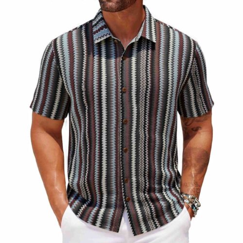 Complete your mens summer outfits with this sophisticated Ethnic Style Shirt. Designed for the modern traveler, this Striped Button Down features unique zig-zag Vertical Stripe Men patterns in a calming Mediterranean palette. This Bohemian Casual Top is crafted from lightweight, breathable fabric, making it an all-match essential for beachside dinners or city exploration. With its relaxed fit and artisanal aesthetic, it stands out as a premium staple in the 2026 European summer collection.