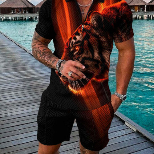 Men’s Tiger Zipper Polo Set commands attention with its high-velocity, primal design. This 3D Fire Beast Resort Outfit features a stunning hyper-realistic tiger head integrated into a modern Orange and Black Geometric Streetwear pattern. Designed as a Zip Lapel Predator Graphic Suit, the quarter-zip collar offers a tailored, sporty alternative to the classic button-down. As a Bold Animal Print Two-Piece Set, the moisture-wicking, breathable fabric ensures you stay comfortable while making a powerful statement at any beach club or urban event.
