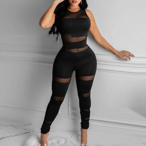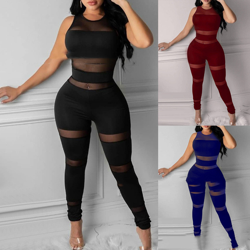 Mesh Panel Jumpsuit Women — make a fierce statement with this ultra-sexy sleeveless bodycon jumpsuit. Featuring bold sheer mesh inserts at the waist and thighs, this one-piece design sculpts and flatters every curve for an irresistible silhouette. Available in classic black, deep burgundy, and vibrant royal blue to match every mood. Perfect for club nights, parties, or date nights when you want to turn heads. A must-have slim fit tight jumpsuit that combines edge, elegance, and confidence in one stunning look.