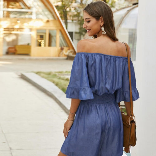 Off Shoulder Romper sophistication meets casual comfort in this stunning denim look blue playsuit. This elastic waist flare sleeve romper features a breezy, lightweight fabric perfect for warm-weather days, offering an effortless boho summer short jumpsuit silhouette that flatters every frame. The feminine shirred waist casual beachwear design provides a comfortable, cinched fit while the tiered flare sleeves add a romantic touch. Ideal for beach strolls or brunch dates, this one-piece ensures a chic, “one-and-done” look for your vacation wardrobe.
