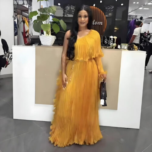 One Shoulder Dress elegance shines in this radiant mustard-yellow gown, featuring fine sunray pleats that create beautiful movement and texture. This One Shoulder Evening Gown is defined by its dramatic asymmetrical neckline and a flowing, cape-like sleeve that adds a touch of couture flair. As a stunning Pleated Mustard Maxi Dress, the floor-length silhouette elongates the frame for a statuesque look. Whether worn as an Elegant One Sleeve Party Dress for a summer wedding or as a Goddess Style Special Occasion Dress for a gala, this vibrant piece ensures a sophisticated and unforgettable entrance.