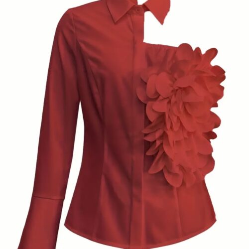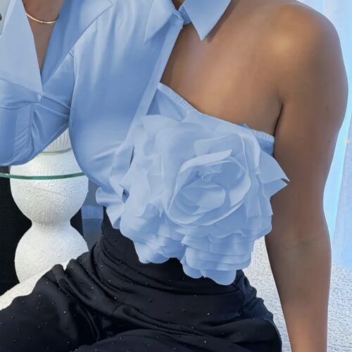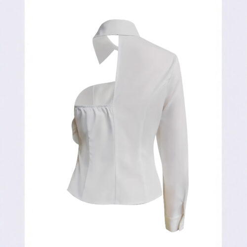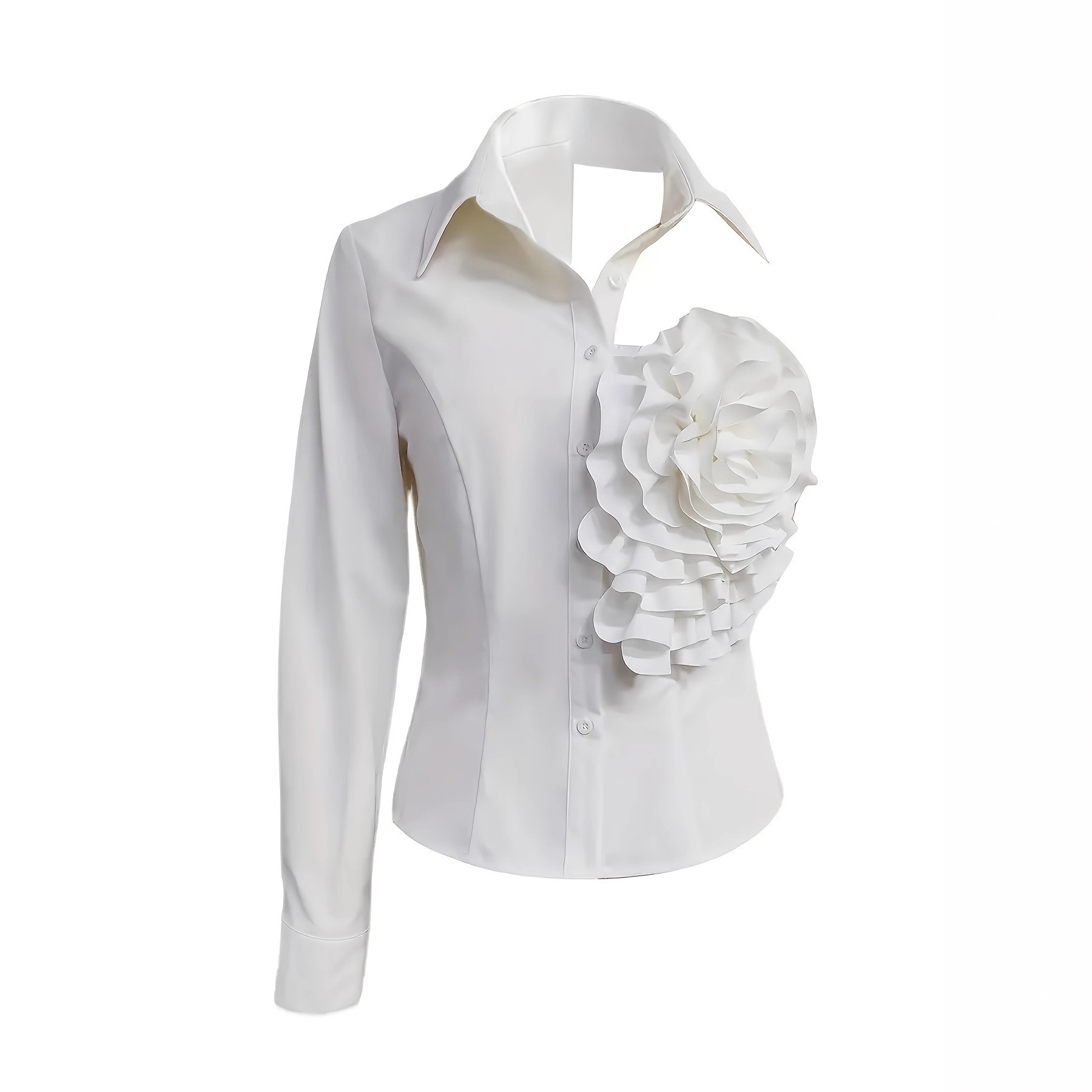 One Shoulder White Blouse is the ultimate statement piece for a sophisticated 2026 wardrobe. This stunning Floral Applique Shirt features a dramatic, oversized 3D rose detail that captures the essence of modern European luxury. Designed as an Asymmetric Long Sleeve Top, it perfectly balances a crisp collared aesthetic with a daring, skin-baring silhouette. Whether you are searching for a Chic One Sleeve Blouse for an upscale brunch or an Elegant White Party Top for a gallery opening, this unique design offers an avant-garde edge that remains timelessly classy.