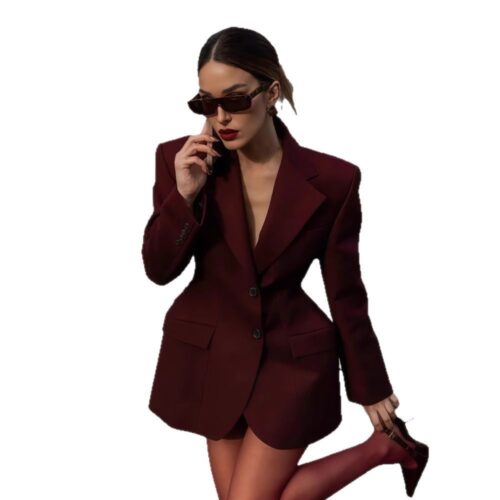 Product Content Oversized Blazer Dress sophistication is reimagined in this deep wine silhouette, perfectly blending executive structure with avant-garde fashion. This stunning burgundy hourglass blazer features a dramatic cinched waist and sharp shoulders to create a statuesque profile. Functioning as a high-end lapel cardigan or a standalone statement piece, it utilizes a double breasted suit jacket closure for a secure, polished fit. As a premier professional mini blazer gown, it transitions seamlessly from high-stakes boardroom meetings to exclusive evening gallery openings, offering a bold look that commands attention in any luxury setting.
