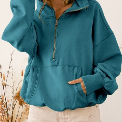 Oversized Half Zip Hoodie designed for the modern woman who values both comfort and aesthetic. This premium quarter zip sweatshirt features a relaxed, boxy fit and dropped shoulders, making it the ultimate athleisure pullover top for gym transitions or casual weekend outings. Crafted from a soft, high-quality fabric, this teal blue sports hoodie provides a vibrant pop of color to your wardrobe while keeping you cozy. Whether you’re layering it over leggings or denim, this versatile fleece hooded jumper offers a functional kangaroo pocket and a stylish funnel neck for maximum warmth and trend-forward appeal.