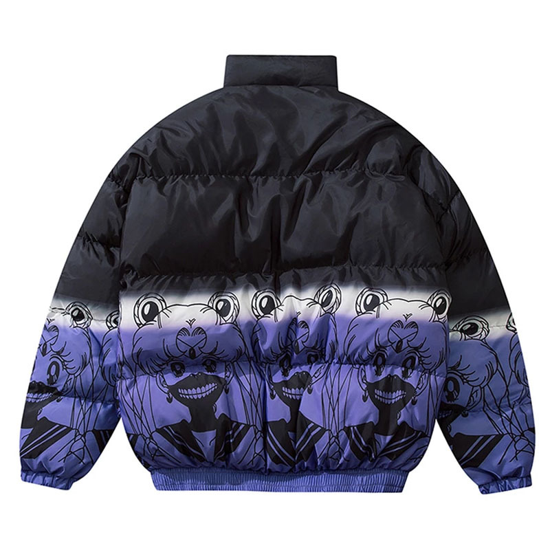 Oversized Padded Parka style meets high-performance warmth in this standout Harajuku-inspired design, a centerpiece for any bold winter wardrobe. This Harajuku gradient puffer jacket features a striking color-melt finish and “Cartoon” graphic elements that provide a high-sense tactile finish. As a premier hip hop streetwear winter coat, it offers an ultra-relaxed silhouette with superior thermal insulation. This men’s anime aesthetic outerwear piece functions as an elite heavyweight thermal urban parka, transitioning perfectly from night travel to city streets.
