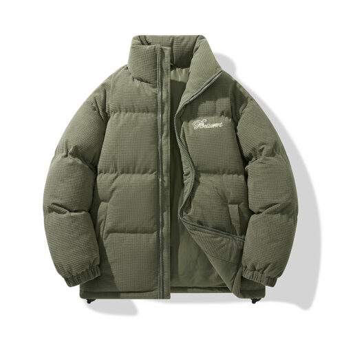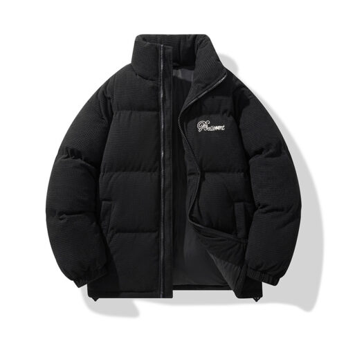 Padded Jacket excellence is redefined in this black, textured design, a cornerstone for any modern winter streetwear rotation. This American style varsity puffer features a premium high-density shell and a standout embroidered streetwear parka chest detail for an authentic vintage aesthetic. As a high-performance stand collar thermal coat, it provides a high-sense tactile finish and superior heat retention. This heavyweight vintage bubble jacket transitions perfectly from urban nights to travel, offering elite windproof protection.