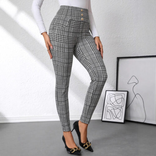 Plaid High Waisted Trousers offer a timeless aesthetic combined with a modern, body-contouring fit for the ultimate style statement. These Check Print Slim Fit Pants are designed with a sophisticated pattern that transitions effortlessly from professional settings to evening outings. Featuring a unique Button Embellished Knit Pants waist detail, they provide a polished look while the high-stretch fabric ensures all-day comfort. Often styled as Houndstooth Slimming Leggings, they sculpt your silhouette beautifully, making them the perfect Stretchy Work Trousers for Women who refuse to sacrifice comfort for fashion.