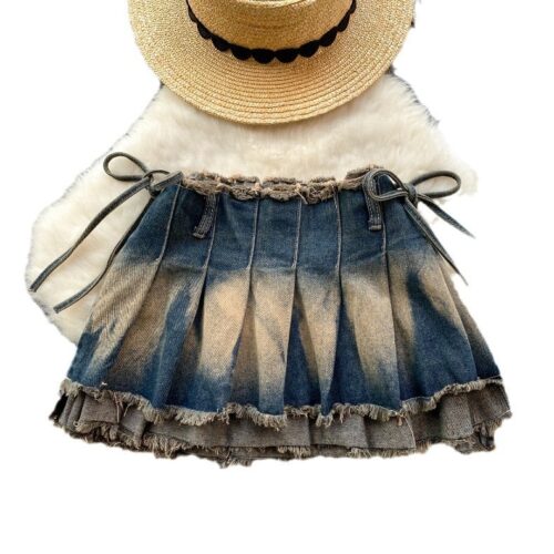 Pleated Denim Mini Skirt style meets a vintage-inspired edge with this unique watercolor-washed piece. This washed blue jean skirt features a distinct gradient effect and distressed raw hems for an authentic, lived-in feel. Designed as a quintessential Y2K aesthetic skirt, it sits perfectly to highlight your silhouette with a trendy low rise pleated skirt cut that adds volume and movement. The delicate denim skirt with bow detail provides a charming, feminine contrast to the rugged denim texture. Ideal for festivals or street-style looks, this skirt is a bold statement for any fashion-forward wardrobe.