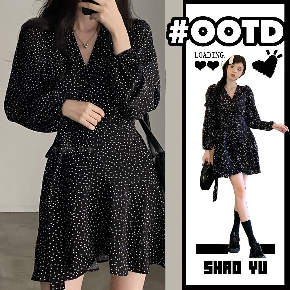 Product Content Polka Dot Dress elegance defines this monochrome silhouette, blending classic charm with modern sophistication. This v-neck wrap dress features a flattering crossover neckline and a waist-cinching tie that creates a timeless, feminine profile. As a versatile monochrome long sleeve dress, it transitions perfectly from professional settings to weekend brunches, embodying the effortless Hong Kong style fashion aesthetic. Finished with a playful slim fit ruffle mini skirt hemline, this lightweight piece offers a comfortable yet polished look for any social calendar.