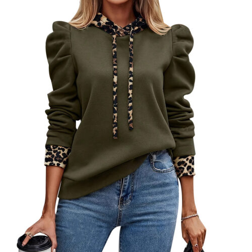 puff sleeve sweatshirt styles are the defining silhouette of the 2026 season, offering a more structured and sophisticated take on traditional loungewear. This Olive Green Hoodie features artfully constructed shoulders that provide a chic, architectural lift without the bulk. The unique Leopard Print Trim Top accents on the cuffs and drawstring add a high-impact animal print contrast that is both playful and polished. Designed as a Puff Shoulder Jumper, it bridges the gap between cozy street style and effortless elegance. Whether you’re layering this Leopard Contrast Sweatshirt for a morning workout or a casual brunch, its machine-washable fabric and breathable design make it a versatile must-have for spring, summer, and fall.