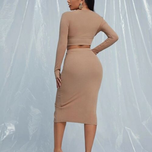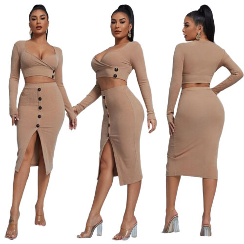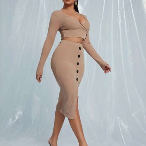 Ribbed Knit Two Piece Set Women — elevate your style with this stunning crop top midi skirt co-ord camel design. Featuring a deep V-neck wrap long sleeve bodycon skirt set top with elegant button detailing, this chic ensemble pairs beautifully with a high-waist button front slit midi skirt set bottom. The rich camel tone makes this casual elegant knit outfit women love perfect for date nights, office looks, or weekend styling. Sophisticated, comfortable, and effortlessly on-trend every season.