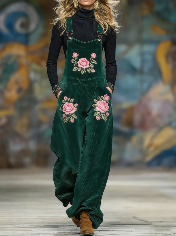 Rose Embroidery details transform these classic silhouettes into a romantic, vintage-inspired statement piece. These corduroy wide leg overalls feature intricate floral motifs on a rich forest-green fabric, offering the timeless charm of vintage green floral dungarees. Designed for versatility, the adjustable strap boho jumpsuit construction ensures a personalized fit, while the flowing floral embroidered wide leg pants provide comfort and effortless style. This one-piece is the perfect choice for those seeking a unique, textured look that blends artistic craftsmanship with a relaxed, modern aesthetic.