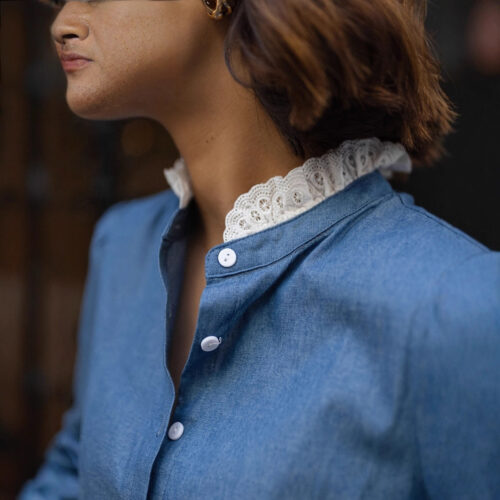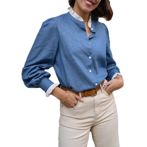Ruffled Collar Denim Blouse is the ultimate fusion of rustic charm and Parisian elegance. This French Style Ruffled Top features delicate white lace detailing on the stand-up collar and cuffs, providing a sophisticated Victorian Style Denim Shirt aesthetic. The Lace Trim Puff Sleeve Blouse design adds a romantic volume to your silhouette, while the Loose Fit Western Denim Top cut ensures all-day comfort without sacrificing style. Perfect for pairing with neutral trousers or skirts, this blouse is a versatile staple for any modern European wardrobe.