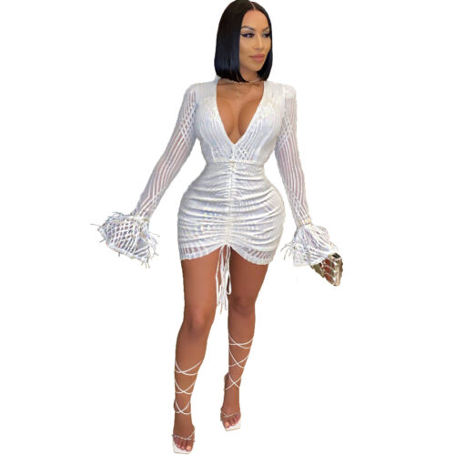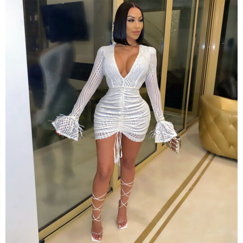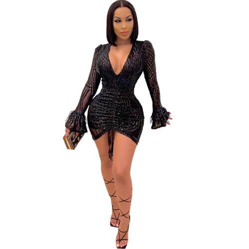 Sequin Mini Dress glamour takes center stage in this radiant red silhouette, meticulously designed for an unforgettable night out. This red long sleeve party dress features a shimmering textured finish that catches the light perfectly, while the ruched bodycon cocktail dress construction sculpts and defines your curves. Designed with a daring deep v-neck sequin gown aesthetic, it is balanced by sophisticated elegant balloon sleeve dress details that add a touch of volume and drama. Crafted from high-stretch fabric, this statement piece ensures you remain the center of attention at any high-profile event.
