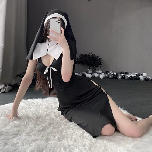 Sexy Nun Costume Lingerie — unleash your fantasy with this daring roleplay fantasy dress women will love. This bold black lace up mini dress features a deep V-neck, thigh-high slit with criss-cross strap ties, and comes complete with an iconic white and black nun veil headpiece. Perfect as a Halloween cosplay lingerie set or intimate exotic costume nightwear women’s choice for adventurous evenings. Mysterious, seductive, and unforgettable — this is roleplay dressing taken to a whole new level of bold.