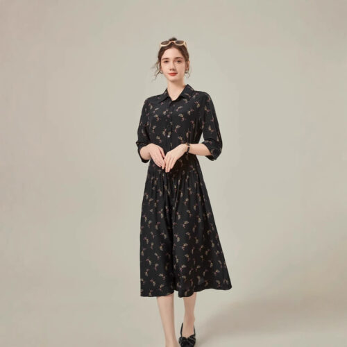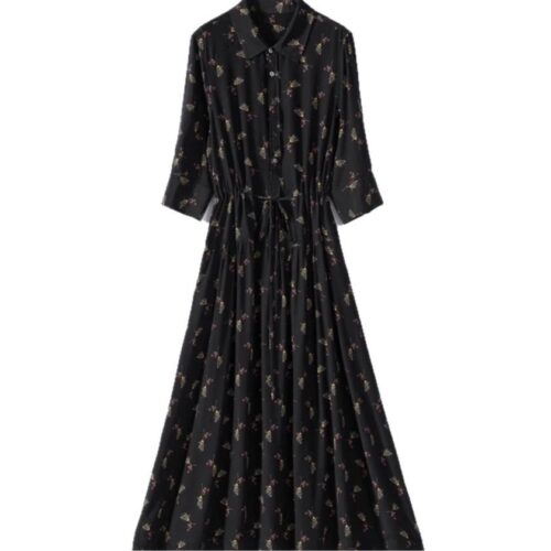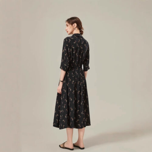 Shirt Dress elegance reaches new heights with this sophisticated black floral piece, designed for the modern woman who values luxury and versatility. This floral midi tea dress is crafted from a premium silk blend, offering the refined feel of a silk shirt dress that drapes perfectly against the silhouette. Featuring a functional drawstring waist silk gown detail, it allows for a custom cinched fit, while the three-quarter sleeves make it an elegant black printed midi suitable for any season. Transition effortlessly from professional meetings to social evenings in this timeless, botanical-inspired staple.