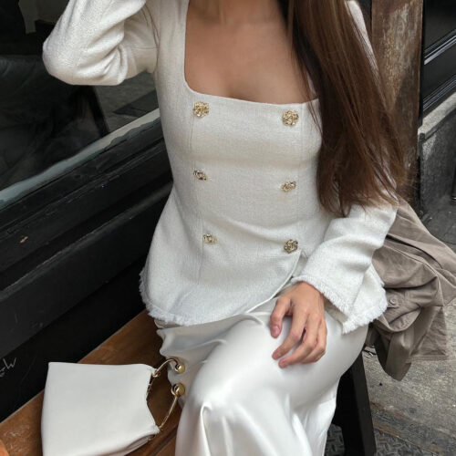 Square Neck Blazer elegance defines this pristine white silhouette, meticulously crafted with a unique structural neckline that offers a modern departure from traditional tailoring. This stunning white tweed crop jacket features a sophisticated textured finish, making it a cornerstone for a high-end capsule wardrobe. As a premier waisted long sleeve suit piece, it provides a statuesque and cinched profile that enhances the natural frame. This minimalist collarless outerwear functions as an elegant slim fit formal coat, transitioning seamlessly from executive meetings to elite social events.