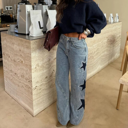 Star Jeans bring a bold, celestial energy to your daily rotation with striking oversized black patches that create a dynamic visual contrast. These baggy wide leg denim trousers are engineered for a relaxed, urban silhouette that prioritizes both comfort and trend-setting style. Featuring unique black star patch pants detailing along the sides, they offer a creative twist on classic denim craftsmanship. As a staple of Y2K straight leg jeans fashion, they sit comfortably at the waist and flow into a spacious leg. Elevate your aesthetic with these loose fit graphic denim essentials, perfect for making a statement in any setting.